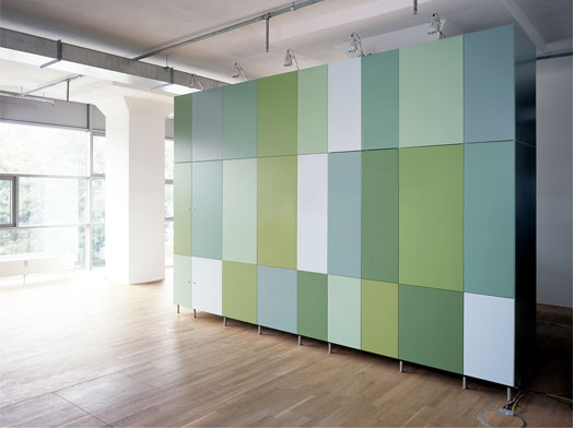 bespielbaren regalwand, die das open office zoniert und ihm ihr gesicht gibt.
